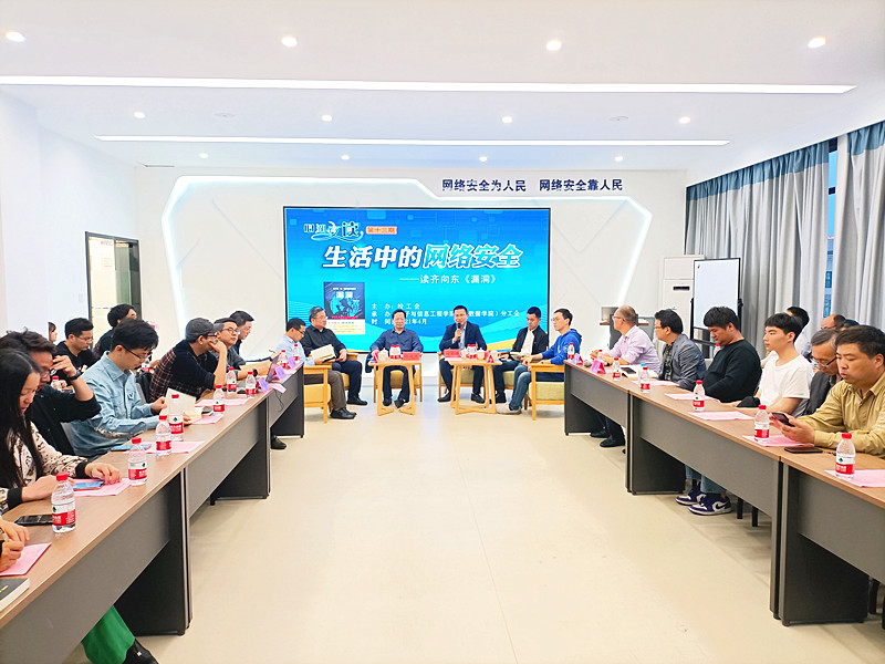 4月29日晚,由校工会主办、电信学院分工会承办的第十三期“心湖夜读”读书会活动在椒江校区奇安信网络空间安全产业学院举行。本次读书会的主题是“生活中的网络安全”——读齐向东《漏洞》,校党委副书记潘通天、工会副主席江岳军等出席活动,电信学院党总支书记王奎东主持,校内各部门、学院三十余位师生员工及奇安信集团嘉宾参加本次读书会。