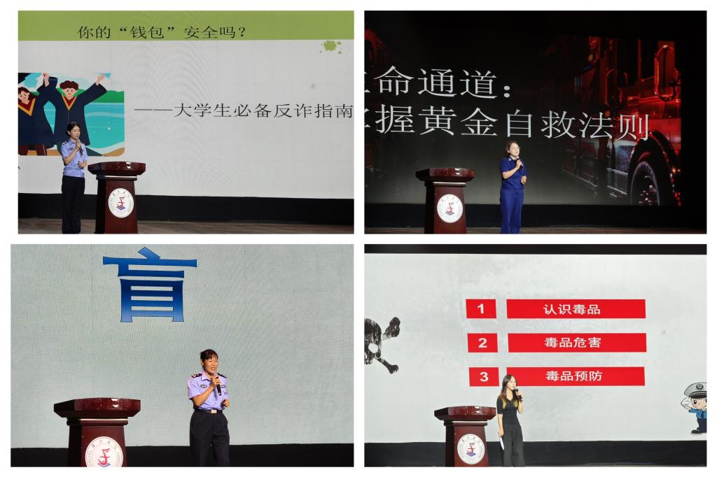 在安全教育讲座中,台州市公共安全教育馆讲师杨韵和临海市公安局民警岩依羞,通过真实案例提醒同学们要时刻保持警惕,积极网络安全相关知识,坚决做到“不听、不信、不转账”,为自己的财产安全筑牢防线。台州市公共安全教育馆讲师徐杨、临海市公安局交警大队民警许丽莉,围绕“交通安全”主题开讲,通过触目惊心的交通事故案例,直观地呈现了交通违规行为带来的危害并引导新生树立“文明出行,安全第一”的意识。台州市消防救援支队路桥区桐屿大道站屈资博班长、临海市消防救援大队宣教员金丹丹通过生动的演示和互动,向同学们传授了在紧急情况下的逃生技巧和自救方法,让同学们受益匪浅。在毒品预防课程中,马克思主义学院副教授、禁毒讲师李正军老师和学生郑梦瑶、李岚心主讲,他们通过典型案例告诫同学们要谨慎交友,远离不良诱惑,坚决抵制“笑气”,守护自己和他人的健康生活。