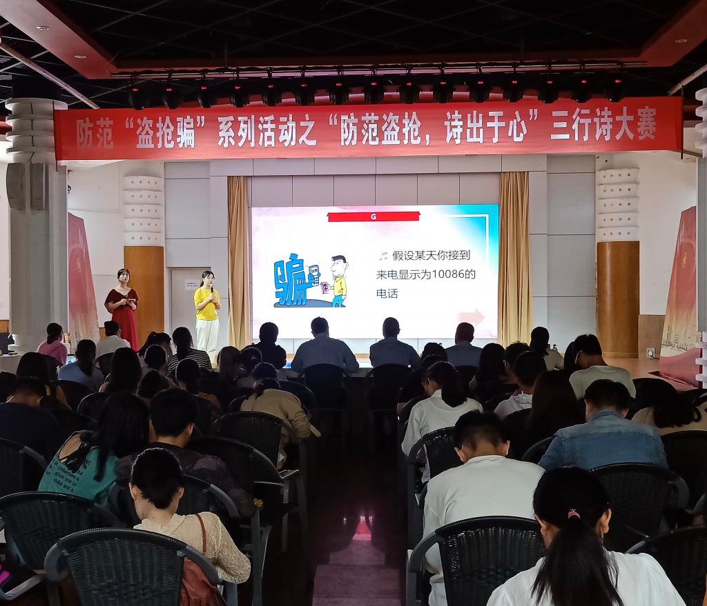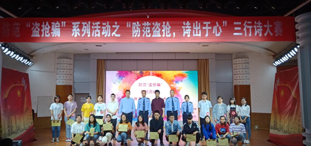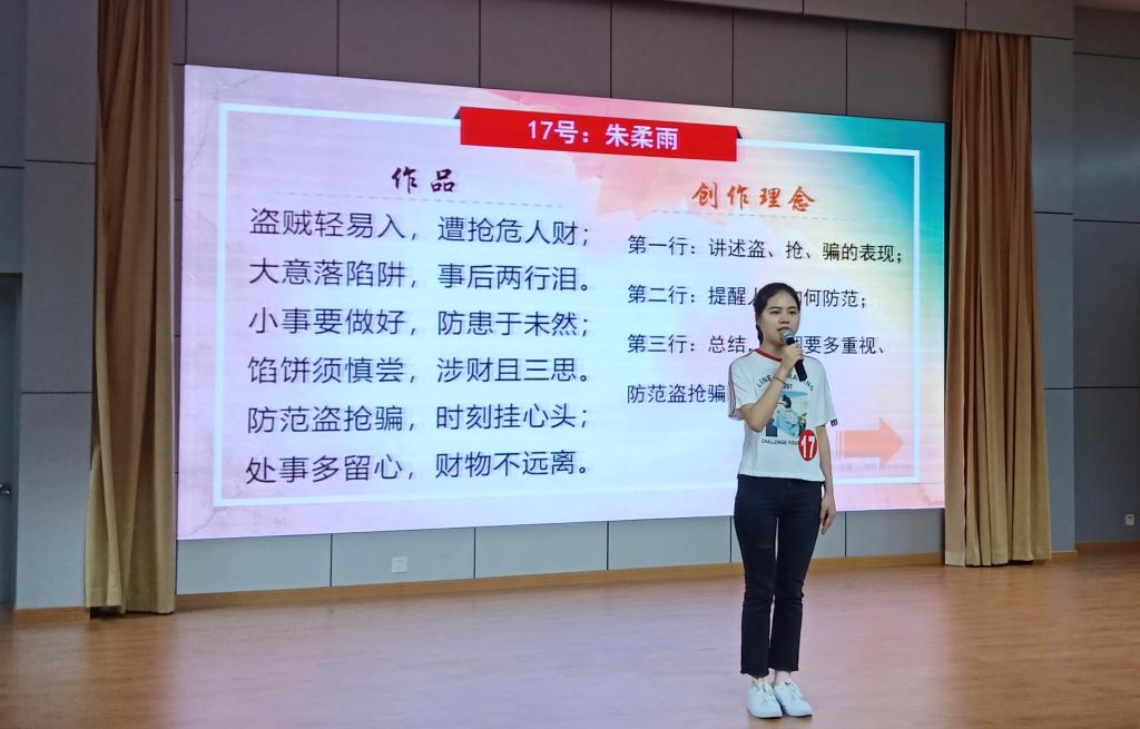 本次活动系我校防范“盗抢骗”系列安全教育活动之一,要求参赛选手以防盗、防抢或防骗为主题创作三行诗,并在决赛现场进行朗诵,向评委及观众介绍自己的创作理念。为了加深广大师生对防范“盗抢骗”知识的理解,活动还创新地设计了情景答题环节,将日常生活中常见的电话诈骗、短信诈骗、面对面诈骗、人身安全、财物安全等情形搬上舞台,即兴表演,既考验选手面对安全问题的处置能力,又提升了在座师生的安全防范意识。选手比拼结束后,大洋派出所的冯家馨警官又结合短视频再次提醒大家注意预防网络刷单诈骗和网购游戏装备诈骗。
