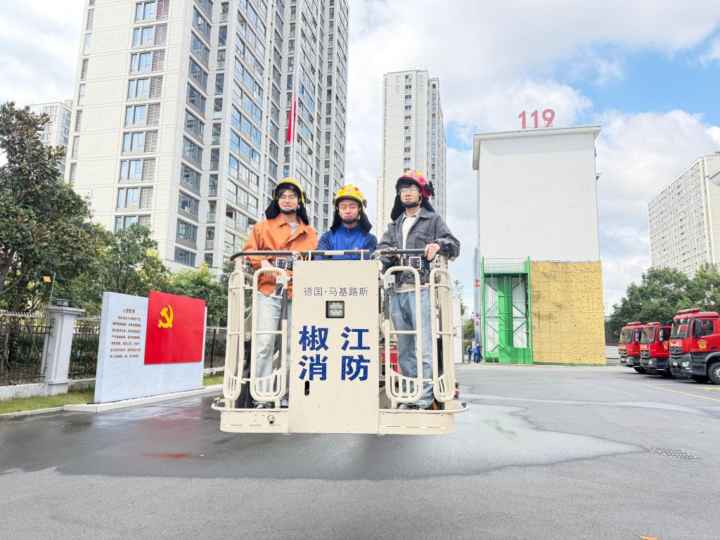 在椒江区消防救援大队宣讲员的带领下,师生们首先了解了消防车的结构与特殊功能。随后,同学们亲身体验了穿戴消防服,切实感受到消防服的厚重,也更加体会到消防员日常工作的艰辛。在接下来的消防水带操作环节,大家学习了如何用力甩出水带,并在三人协作中掌握了基本操作要领。最后,师生们登上消防云梯,随着设备缓缓升高,大家不仅体验了高空作业的环境,更对消防员在救援中的勇敢与专业肃然起敬。