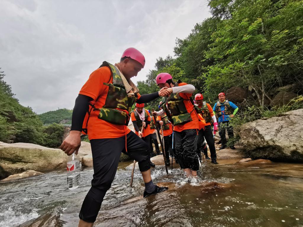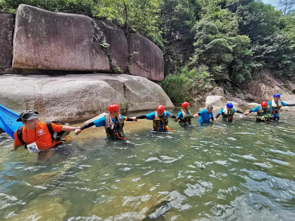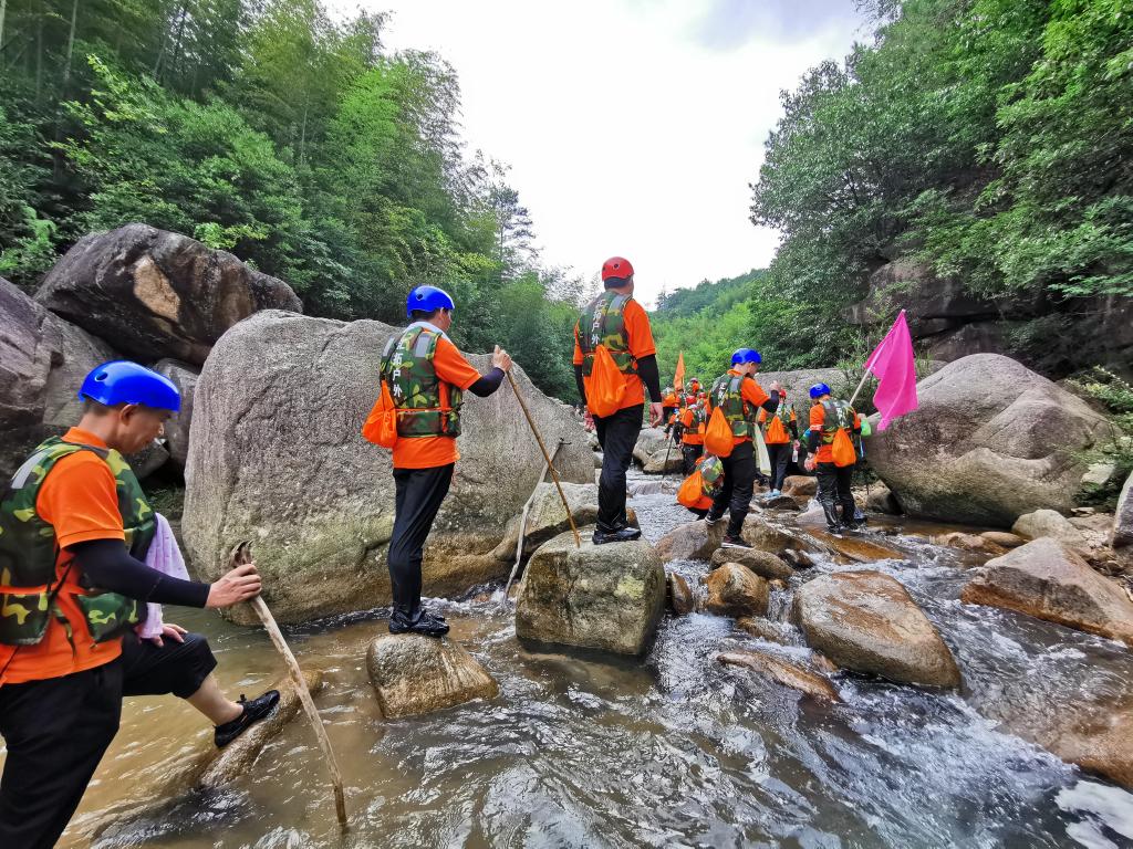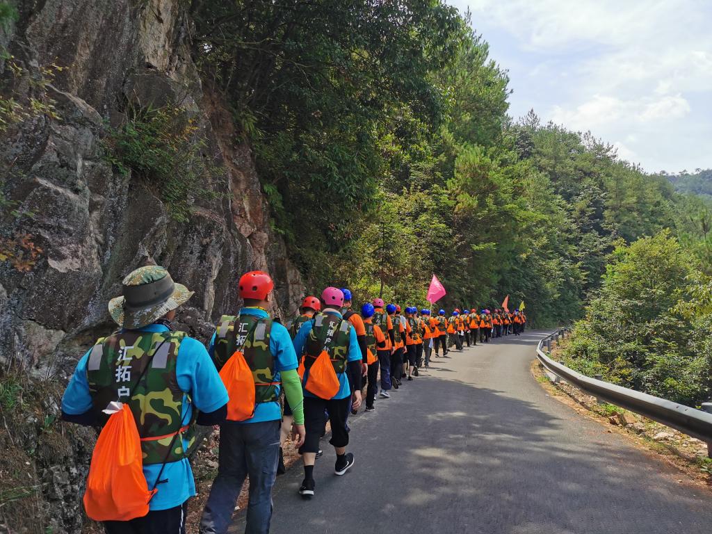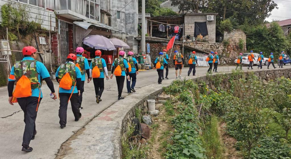 此次活动选择天台县,以石梁溪溯溪为主要拓展内容。“破冰团建”首先在石梁镇慈圣村进行,帮训教官将参与人员随机分成三组,分别选出队长与副队长,完成团队文化建设,包括队名、队训、队徽等,大家身着统一的队服,斗志昂扬地展现团队风采。接着,大家领取补给物资、身穿救生衣后,迈着整齐地步伐,列队前往石梁溪溯溪的起点。