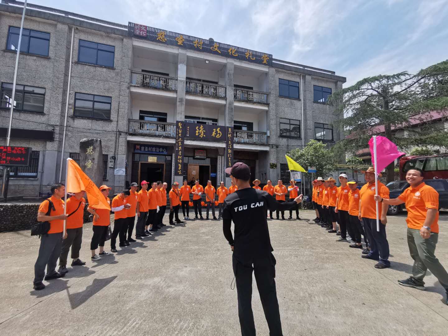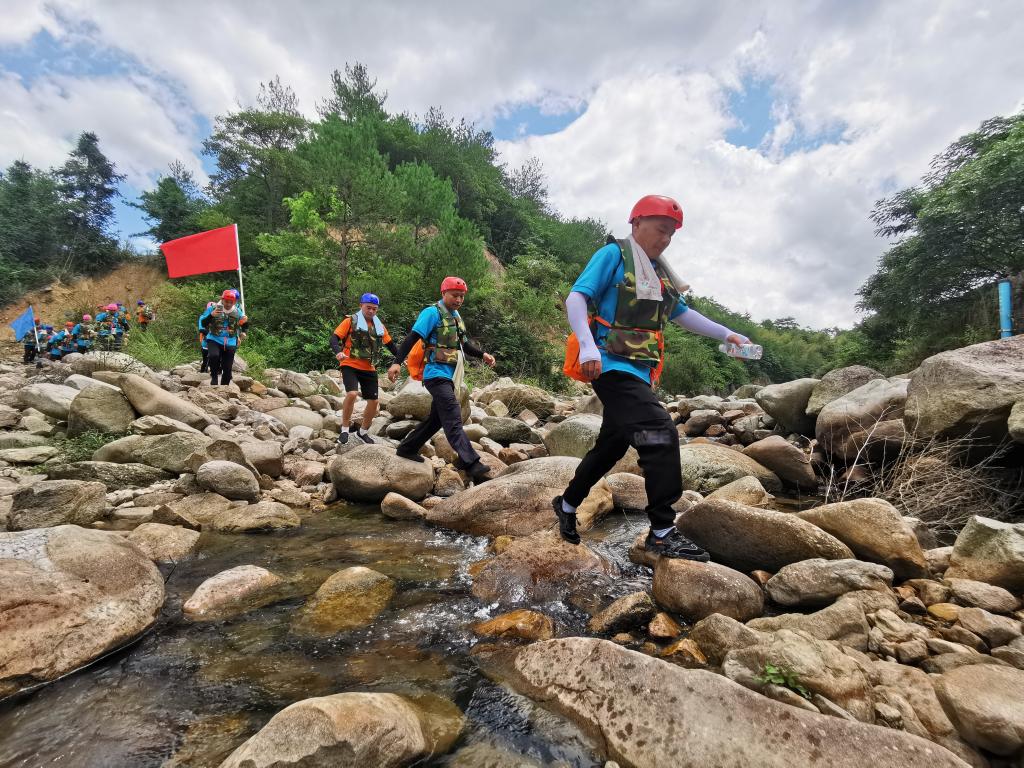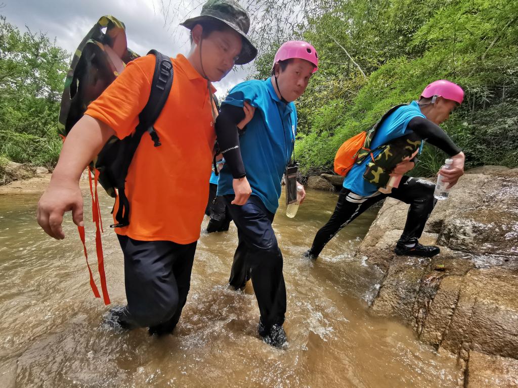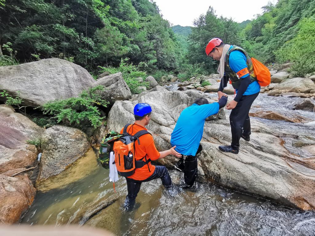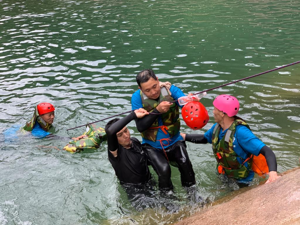 此次活动选择天台县,以石梁溪溯溪为主要拓展内容。“破冰团建”首先在石梁镇慈圣村进行,帮训教官将参与人员随机分成三组,分别选出队长与副队长,完成团队文化建设,包括队名、队训、队徽等,大家身着统一的队服,斗志昂扬地展现团队风采。接着,大家领取补给物资、身穿救生衣后,迈着整齐地步伐,列队前往石梁溪溯溪的起点。