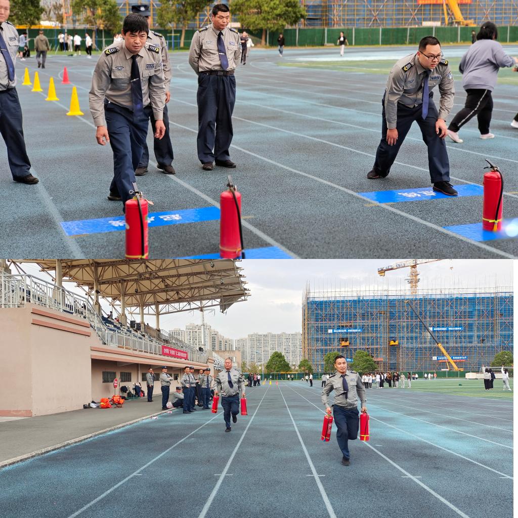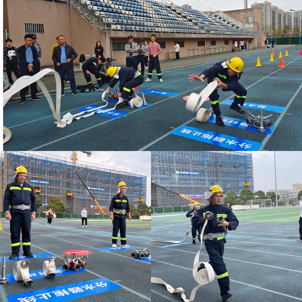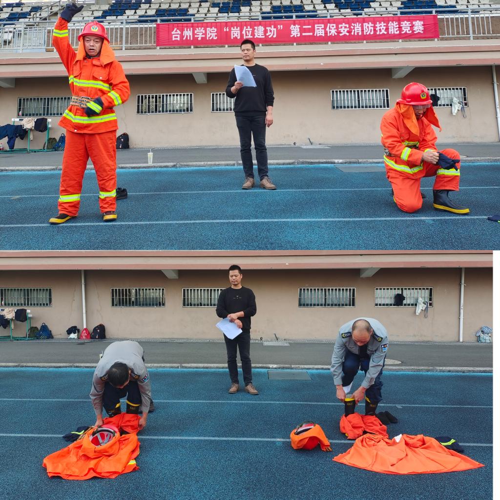 本次竞赛设有两盘水带连接、携两具灭火器50米跑、快速着消防服3个项目,每个项目椒江校区和临海校区各选派4名保安队员参加,人员不得重复。两盘水带连接是整个消防技能竞赛中难度最大的项目,要求参赛队员穿戴好防火服、防火靴、防火头盔,然后检查好器材,携带好水枪,听到“开始”口令后,快速甩开第一盘水带,一端接上分水器接口,另一端接上第二盘水带,然后行至甩带线甩开第二盘水带,边跑边连接好水枪,快速冲到终点线。尽管操作步骤复杂,但参赛队员遇水带出线、压线或扭圈360度等状况时都能冷静处理、沉着应对。