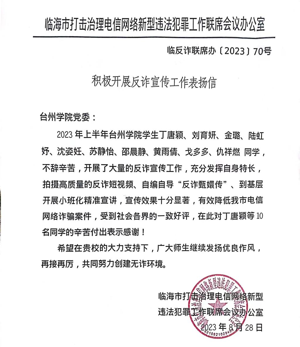 近日,由校保卫处组建的“诈骗终结者”宣讲团收到了一封来自临海市打击治理电信网络新型违法犯罪工作联席会议办公室的表扬信,信中表达了对我校教师教育学院(体育学院)学生丁唐颍等10位同学为预防电信网络诈骗工作做出积极贡献的感谢。