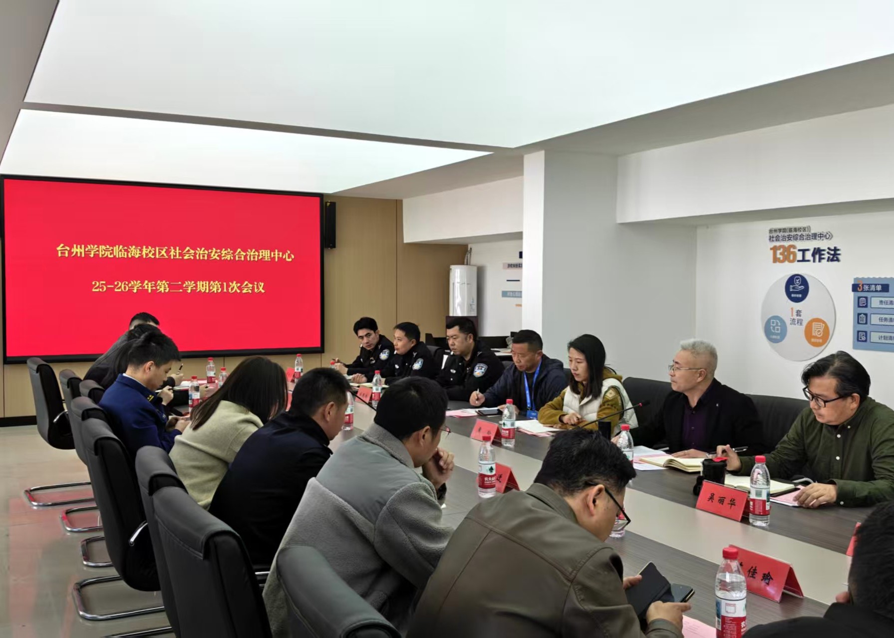 临海市政法委相关负责人对综治中心前期的工作成效给予了肯定,对各共建单位的密切协同、积极配合表示赞许,并结合校园治理工作新形势对学期工作提出了相关要求:一是要进一步优化入驻机制,整合校地各方优质资源,实现资源共享、优势互补;二是要进一步创新工作内容与方法,提升校园综治工作的精细化、科学化管理水平;三是要进一步强化协作联动,健全常态化沟通对接机制,凝聚校地共治工作合力。