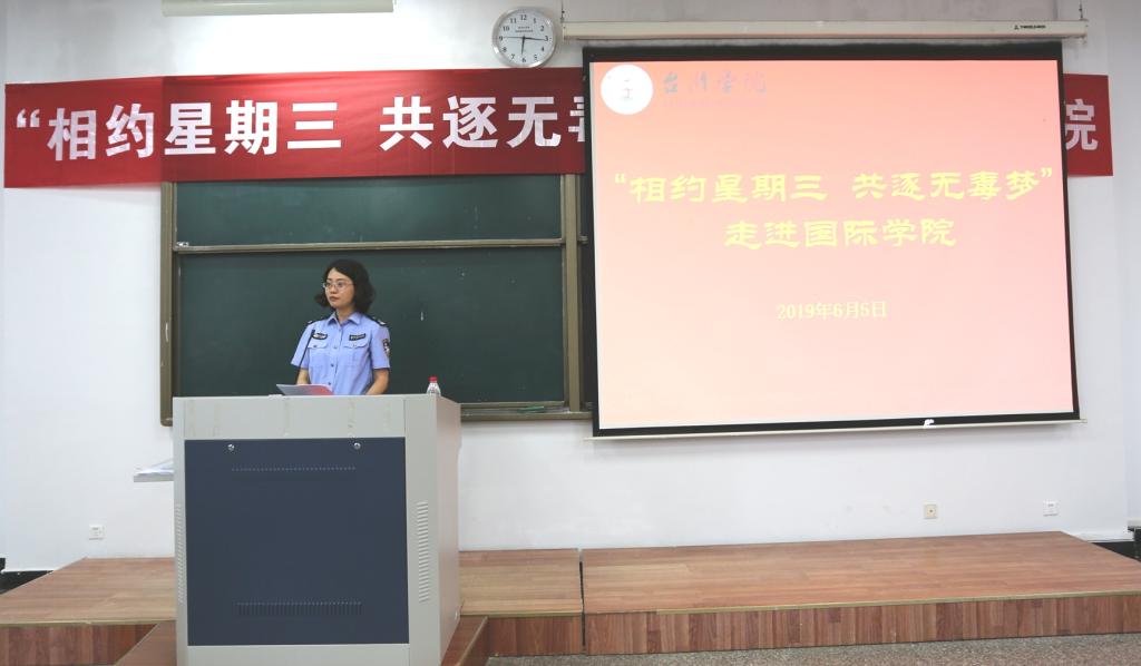 6月5日晚,市禁毒办联合校保卫处在椒江校区举办“相约星期三 共逐无毒梦”校园宣讲活动。市禁毒办副主任瞿茜出席并讲话;宁波大学刘昱博士应邀作专题讲座;椒江公安分局禁毒大队大队长郑鹏、副大队长张杰,国际学院院长王秀萍、副院长王爱琴以及国际学院150余名外籍留学生等共同聆听讲座;校保卫处处长杨启富主持活动。