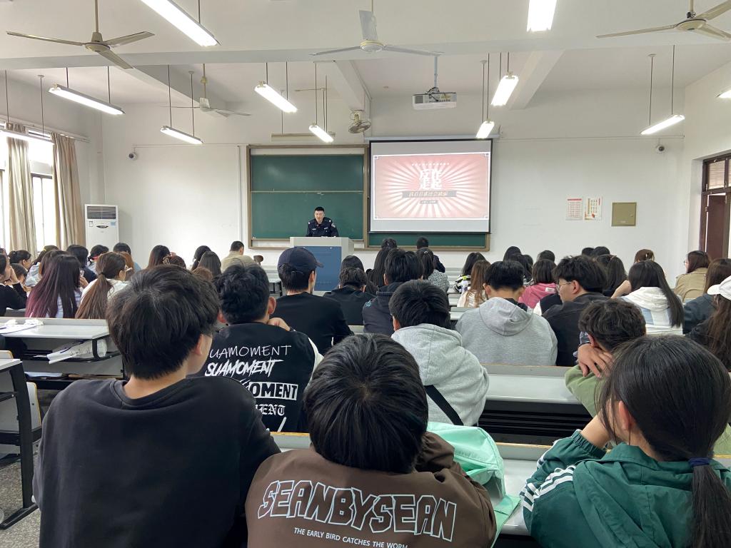 4月12日,“相约星期三”平安微课第44期走进椒江校区2021级学生群体。葭沚派出所民警於鹏、董为杰应邀担任主讲,为现场130余名学生讲解反邪教及防范电信网络诈骗相关知识。