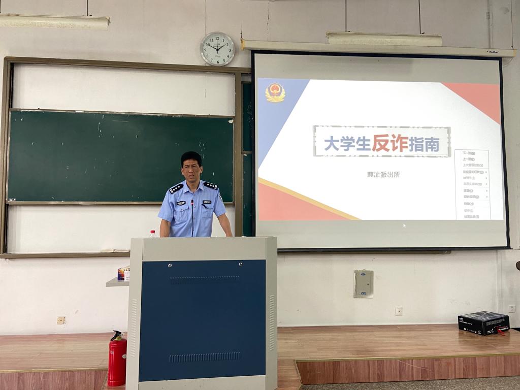 5月17日,“相约星期三”平安微课活动走进椒江校区艺术学院。葭沚派出所民警王冠军受邀担任主讲,为艺术学院两百余名学生讲解防诈骗知识。