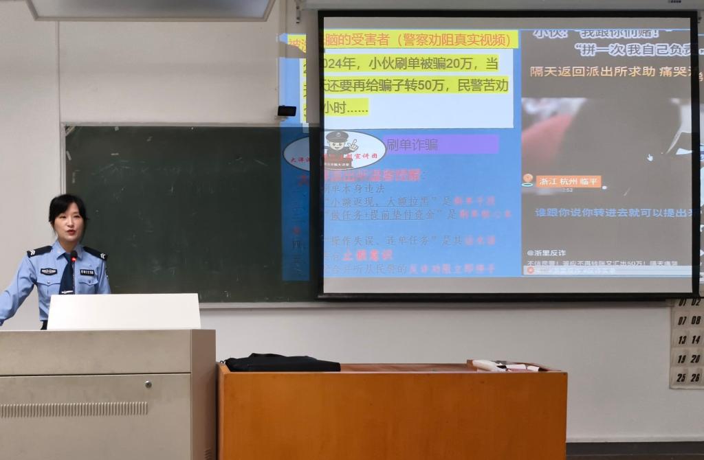 本次讲座以大学生易触犯的“诈骗”为主题,开篇以一份学生群体在临海市的发案情况为切入点,巧妙引入“反诈骗”概念。徐警官首先讲解案件的诈骗类型,如冒充身份类、网络交友类诈骗等,进而介绍具体案例,讲解受害人贪小便宜的心理及常见诈骗手段,如刷单、无平台游戏交易等,层层递进,深刻点明诈骗的内核。她提醒广大学生务必提高戒备心,做到不轻信、不乱信,切勿因蝇头小利而损失大财,使自己陷入不利境地。