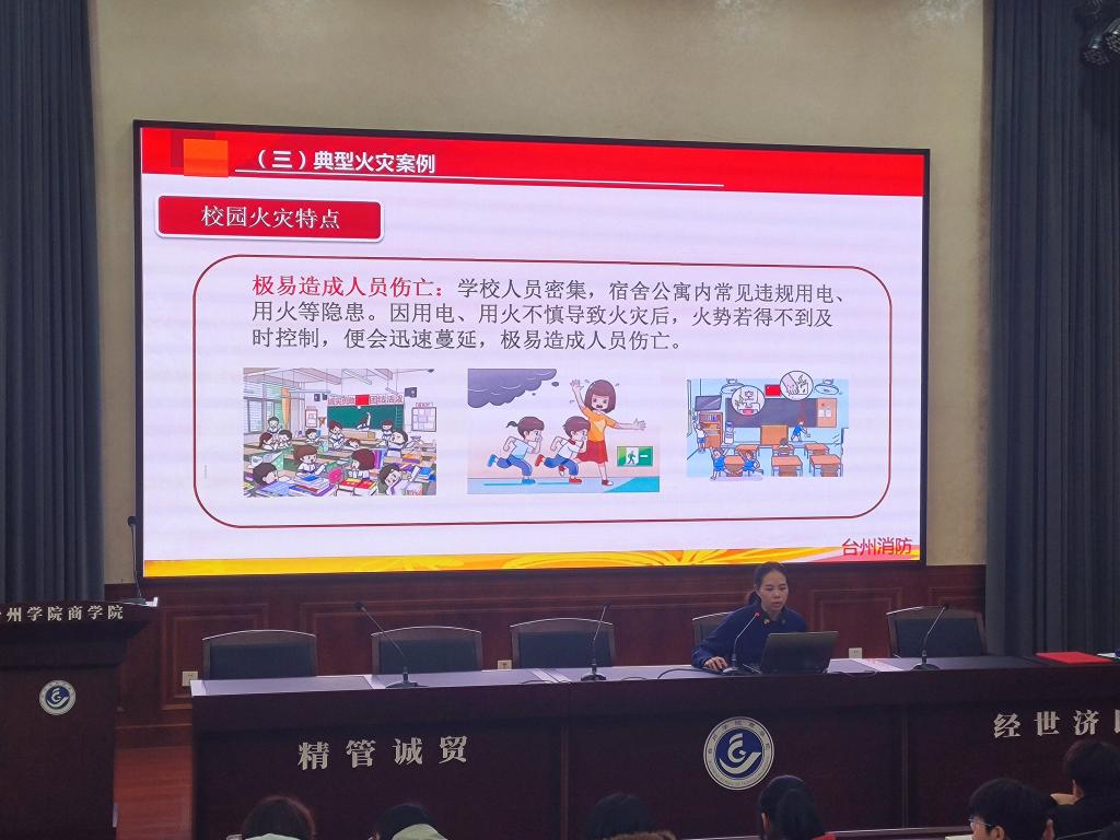 3月7日下午,椒江区消防救援大队宣传骨干蒋雨薇女士应邀来我院开展消防安全知识专题宣讲,并向蒋雨薇颁发“消防安全辅导员”聘书,学院全体辅导员和学生干部参与活动。