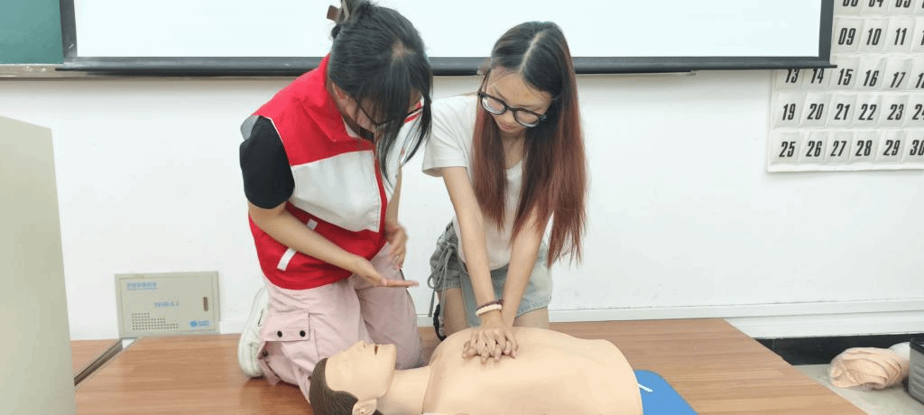 在课堂上,郑老师首先介绍了溺水频率高发的地点并且分析了常见的溺水原因;同时,在助教的协助下,郑老师给大家演示了游泳时突发肌肉抽筋的紧急处理;随后,郑老师向同学们分别介绍了作为施救者和溺水者的不同施救方法和自救方法。在互动环节,郑老师向同学们提出问题并用通俗易懂的方式向同学们解释,便于大家理解救援方法的原理。最后,在台州学院红十字会的专业教学下,同学们学习了溺水后的急救方法,并在模拟假人上进行实践,让大家真正了解和掌握了急救知识。