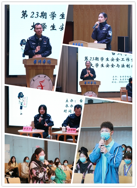 专家们通过通俗易懂的法律知识结合生动鲜活的工作经历给我们上了一堂非常精彩的法制教育课。黄志伟从案例出发,详细说明了近年来大学生被诈骗的原因和形式,强调了安全防范的重要性;奚陈虹从大学生犯罪问题切入,对在校大学生提出“认识自我、坚持学习、提高警惕”三点建议;黄婉秋结合自己的校园及工作经历,在交通安全、防范盗抢、防范诈骗等方面提出相关建议。提问环节,与会专家结合工作经历,耐心解答同学们关于防诈骗、网络安全、刷单问题等方面的提问