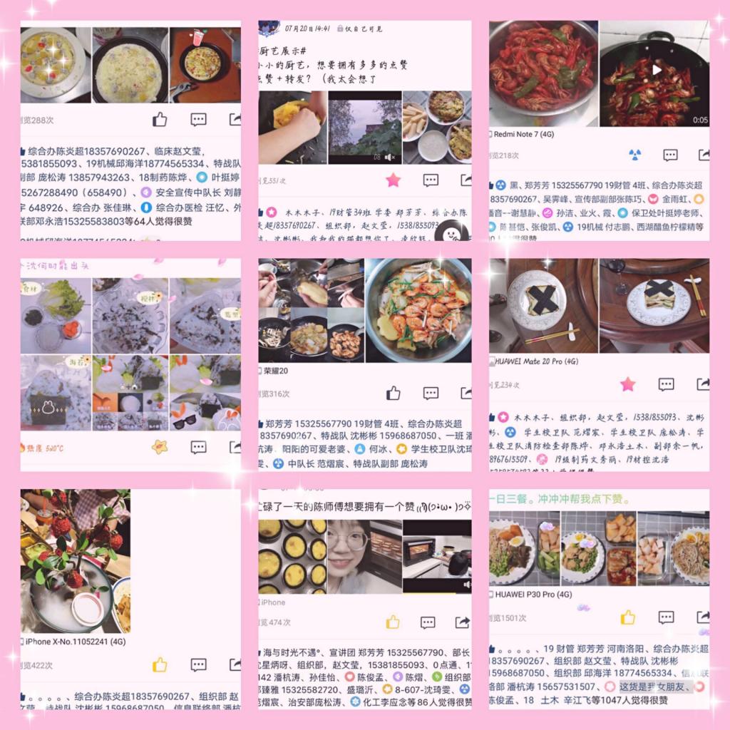 而椒江校区学生校卫队则是以制作美食并分享集赞的形式进行。参赛的“大厨们”各显身手,有色泽金黄、松散可口的蛋挞,构思巧妙、仙气飘飘的“妃子笑”,果香四溢的草莓酸奶与自制咖喱饭,还有色香味俱全的麻辣小龙虾、明虾煲、小饭团等等。一道道颇具心思的美食,一次次热情洋溢的分享,让这个原本单调乏味的夏天变得多姿多彩,意义非凡。