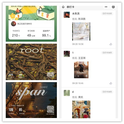 活动伊始,学生校卫队利用微信小程序建立了活动小组,除了队员们的自主打卡以外,也有专门负责人统计每日打卡情况,让每位队员的脚印都切切实实地落在了暑假的历程中。本次活动累计打卡1000余次,近20位队员坚持打卡35天以上,个人累计背单词数达到5558个,背单词总数达到了将近90000个。辛勤的汗水洒在追求的沃土里,才能培育出成功的果实。队员们的每日付出都是伴有收获的。因此,本次活动也对在背单词总量排名前六的同学进行了实质性的奖励。物质上的财富是种激励,而在40天中获得的精神财富却是无价的。