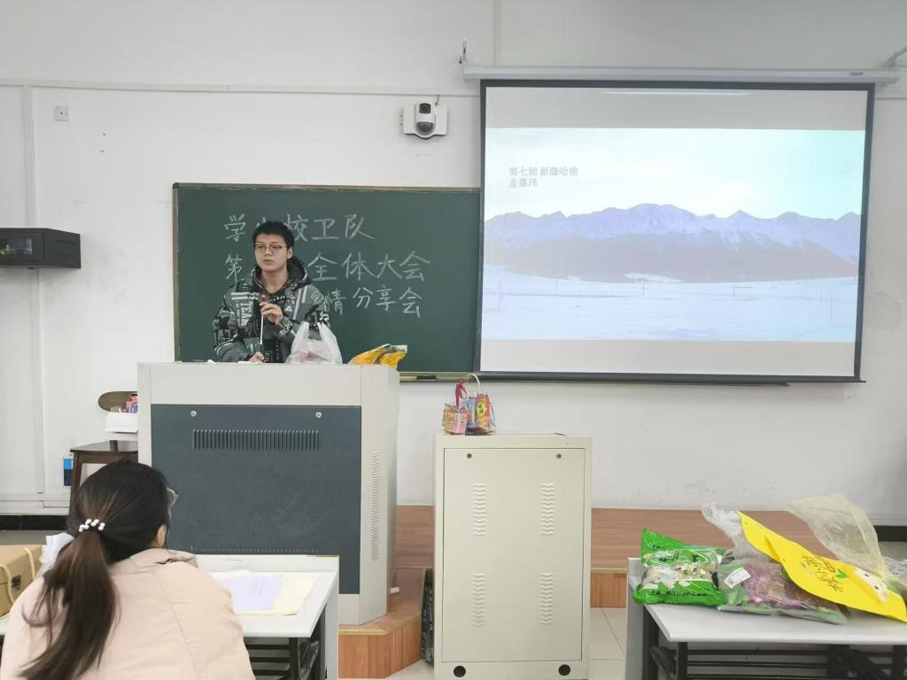 会议初始,队长团详细规划了本学期各部门工作。随后,三位老师对上学期校卫队的工作进行总结,在给予肯定的同时,也对新的学期提出了期望。家乡风情分享会环节,队员们按地域分组,各组员相继上台介绍自己家乡的风情习俗和特产,来自五湖四海的朋友所带来的特产琳琅满目。在分享的过程中,大家结合精美的PPT介绍家乡美不胜收的景点或是关于特产的由来,并盛情邀请大家到自己的家乡游玩。期间还穿插了“方言猜猜猜”等活动,活动结束后,队长团依据评分选出最受欢迎小组,并送上零食大礼包。