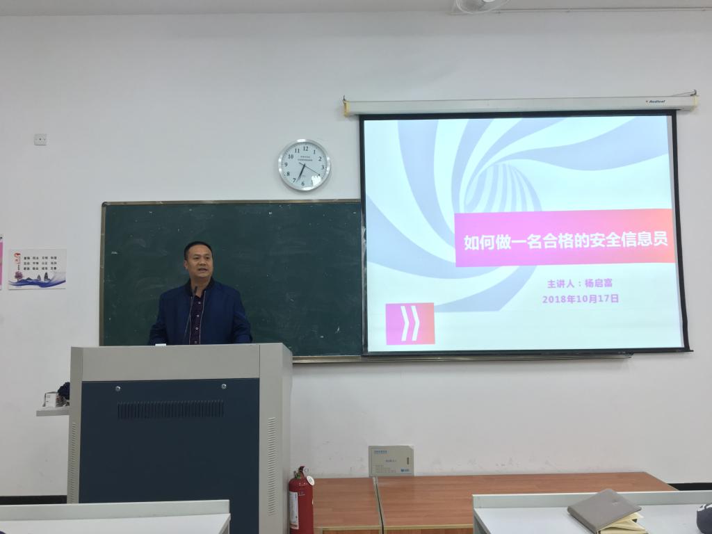 杨启富处长从安全信息员的角色定位、工作任务、工作要求、奖励机制四方,结合形象生动的图片、案例,就如何做一名合格安全信息员作深刻阐述,对安全信息员工作给予具体业务指导。叶挺婷老师围绕防诈骗、防盗窃、消防安全、交通安全等主题作安全知识培训,同时对安全信息员的具体工作任务进行部署,要求各班组织召开相关主题班会,普及安全知识。