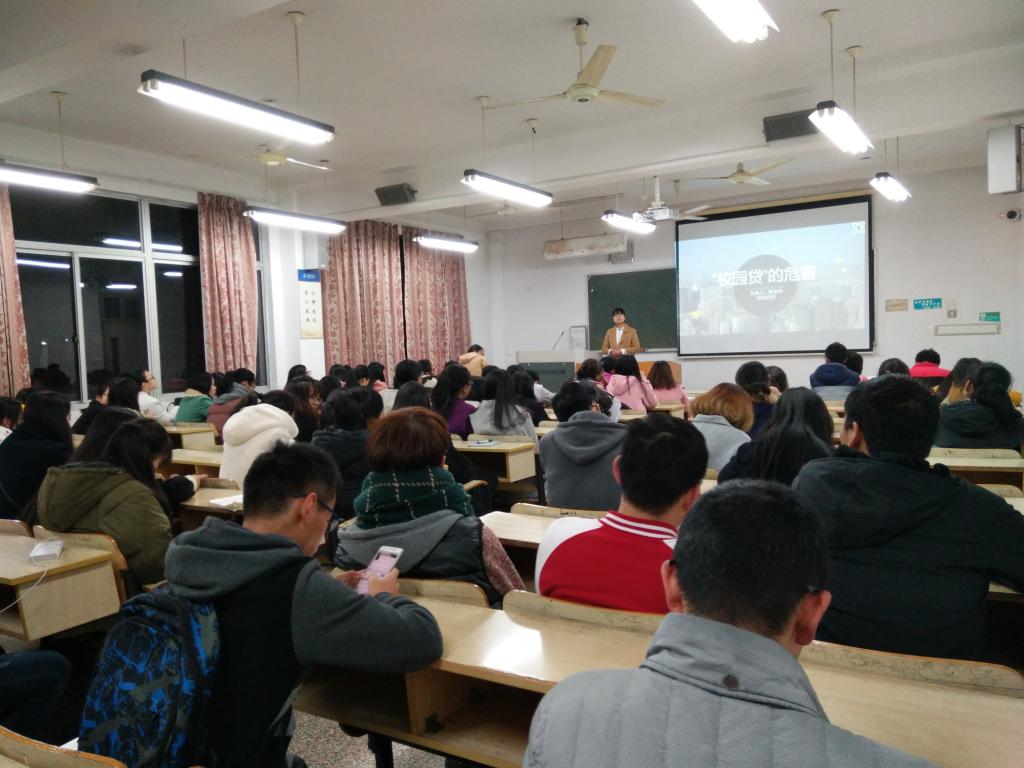 首先,学生宣讲团林依婷从“校园贷”的概念、“校园贷”的风险、“校园贷”的案例、社会各方的态度四个方面出发,对防范“校园贷”的必要性进行深刻阐述。她以分期付款购买iPhone7手机为例,现场对分期所付利息进行演算,得出最后所付本息远高于原价的结果,揭穿了“校园贷”诱人的广告语背后“利滚利”的高利贷实质。一个个真实案例的穿插,打破了同学们脑中“‘校园贷’离自己很远”的固有想法,让同学们真切地感受到“校园贷”的潜在危险就在身边。