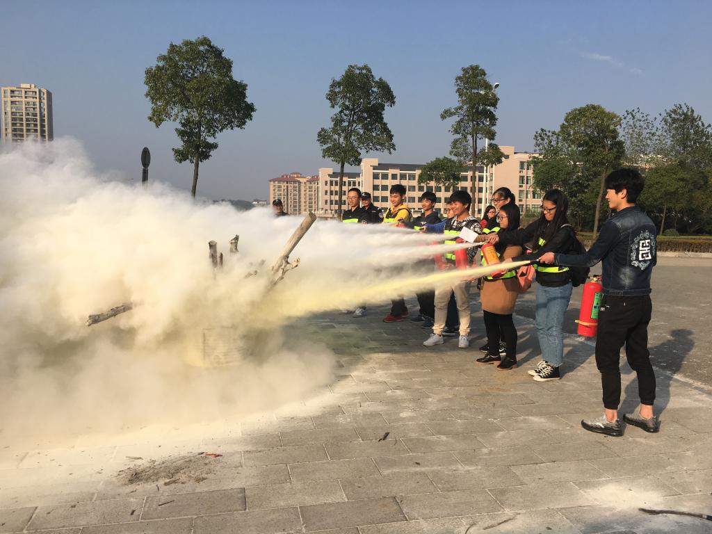 在随后的灭火演练中,面对铁桶中熊熊燃烧的火焰,每个人都表现得十分积极勇敢,手持灭火器,按照灭火器的使用方法和步骤迅速将大火扑灭。