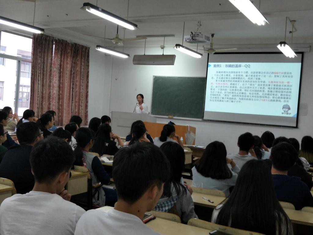 培训会初始,叶挺婷老师播放了一些典型的防诈骗安全宣传片,使同学们对一些常见的诈骗手段以及应对方法有了大致的了解。随后,由椒江校区学生校卫队安全宣传中队的中队长廖青青为大家开展此次的安全知识培训。廖青青同学围绕如何提高安全防范意识的主题,结合冒充qq好友诈骗、微信虚假红包、刷单兼职诈骗等真实的案例,介绍了防诈骗、防盗窃、政治安全、人身安全等方面的安全知识。她指出,被骗案件的发生不只是骗子的手段高明,而更多是由于我们在校大学生防范意识的缺失。最后,廖青青同学还向大家介绍了寝室防推销的方法——在门上贴上相关的提示语,可以有效地减少推销人员进入寝室。接着,叶老师做了相应的总结,她希望同学们能多掌握安全知识,提高自身的安全防范意识,树立正确的金钱观、价值观。