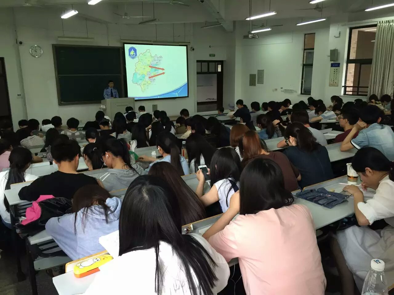 讲座现场,刑侦支队大队长徐敏杰同志针对现在通讯网络诈骗多发的现象,通过案例讲解和PPT展示的方式向大家详细介绍了虚假中奖信息、淘宝兼职刷信誉,假冒亲友引诱汇款等通讯网络诈骗常见手段。徐敏杰同志再三提醒各位学生遇到此类案件,一定要坚持“三不”原则:不轻信、不透露、不转账。一旦上当受骗应及时报警,同时保存好相关证据材料。