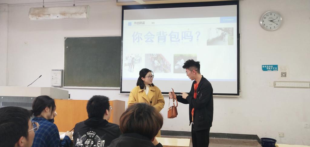 讲座中,叶挺婷老师从近年来“盗抢骗”事故频发入手,结合真实的数据、案例告诉在座的同学们掌握安全知识的重要性。随后,叶老师从家庭防盗、外出防盗、车辆防盗三个方面进行了着重讲解,以图片、视频和现场示范相结合的方式让大家在轻松愉快的氛围中快速学会相关技巧,如防盗门塞的使用、手提包的正确背法、阳台上的“风铃防盗法”等。叶老师还对近期较为常见的诈骗手法进行分析、讲解,提醒同学们遇到QQ、微信“好友”要求转账汇款时,务必打电话或当面进行确认,以免被骗。