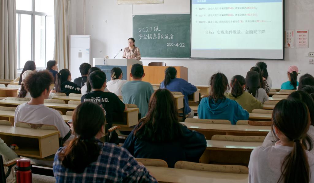 会议伊始,叶老师结合近段时间校园内高额损失的诈骗案例,为在场的同学敲响了警钟,提醒大家提升防诈骗意识,降低被诈骗风险。其次,叶老师对即将开展的安全知识百场大巡讲活动做了详尽的工作部署。根据宣讲时间安排表的内容,各位安全信息员将在接下来的安全知识百场大巡讲中与学生校卫队的宣讲员进行对接,努力做好大巡讲活动的准备工作。会议的最后,叶老师不仅要求大家保护好个人信息,谨防诈骗新手段;还与在场的安全信息员围绕电动车管理、疫情防控等安全问题进行了交流互动。