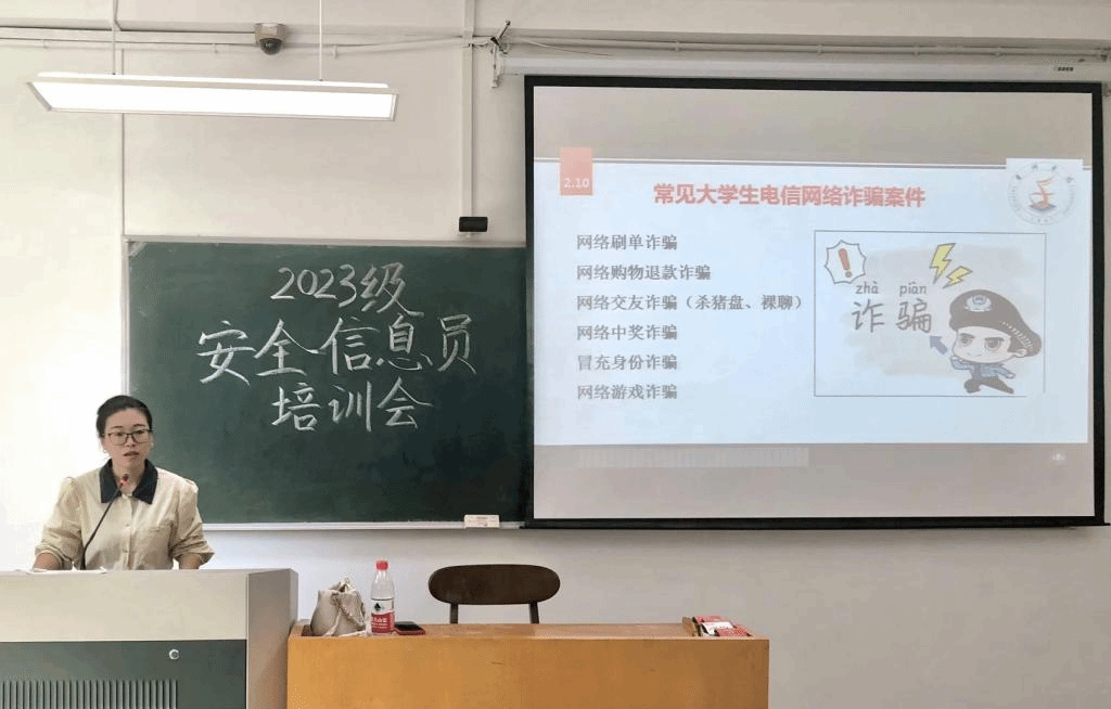 大会伊始,叶挺婷老师以“如何做一名合格的安全信息员”为主题,用贴近日常生活中的具体案例作为引入,从“个人权益”“兼职陷阱”“电器使用”“琐事矛盾”“情感压力”等多个方面介绍了我们身边存在的各种安全隐患,并提出具有针对性的预防措施,以此来增强学生的自我保护能力。随后,叶老师结合自身工作经验,就频发的诈骗事件向同学们强调提高防范意识的重要性。其次,叶老师明确了安全信息员应具备的素质能力与职责,提醒安全信息员务必注重事情真相,做好带头工作,不造谣、不信谣、不传谣。在会议的最后,叶老师对下一阶段的工作安排做出简单部署,学生校卫队信息部也为全体安全信息员讲解了考核机制。