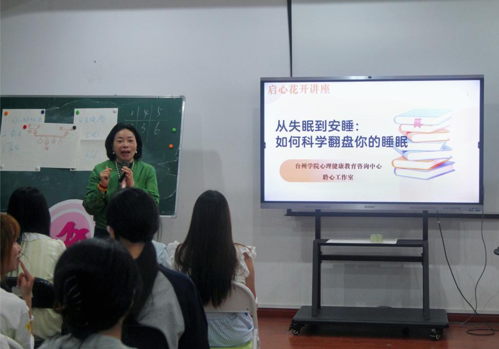 为普及科学睡眠知识,提升学生心理健康素养,5月13日,由台州学院心理健康教育与咨询中心主办、教师教育(体育)学院聆心工作室协办的“启心花开——从失眠到安睡:如何科学翻盘你的睡眠”主题讲座在学生活动中心202成功举行。本次活动特邀校心理健康教育咨询中心金彩云老师担任主讲,30余名学院学生参与讲座。