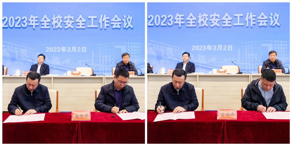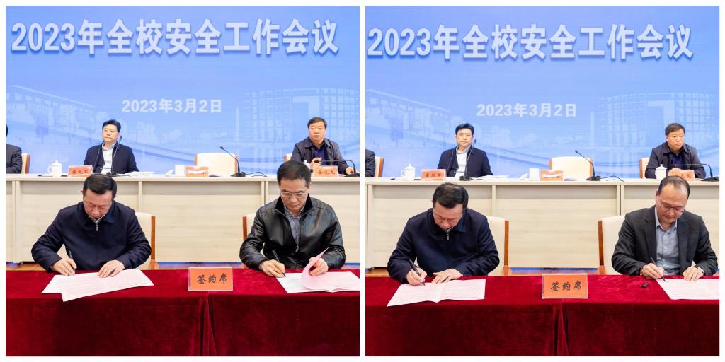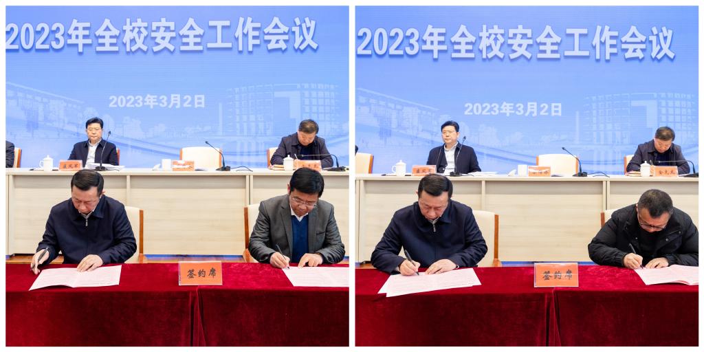 会上,乐传永校长代表学校与各二级学院、职能部门签订了安全责任书。金先龙副书记回顾总结2022年学校安全稳定工作,对2023年“平安校园“建设和校园治安综合治理工作进行了部署。